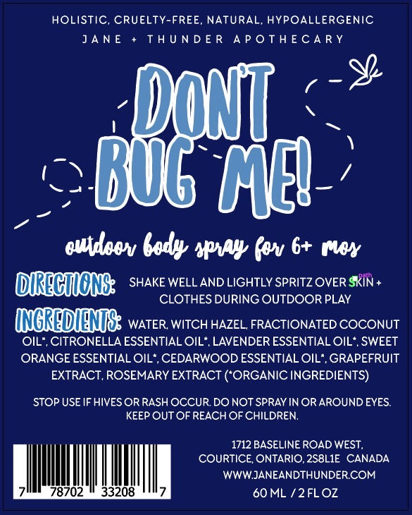 Out door body spray for the whole family. Shake well and spritz over your family avoiding spraying directly in the face or eyes.